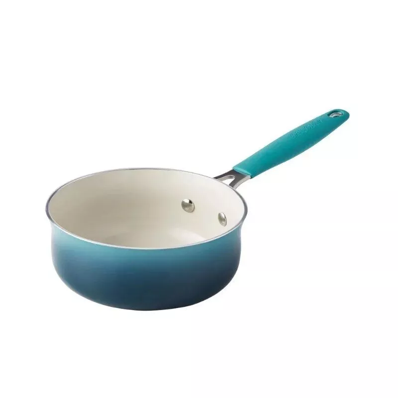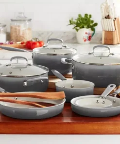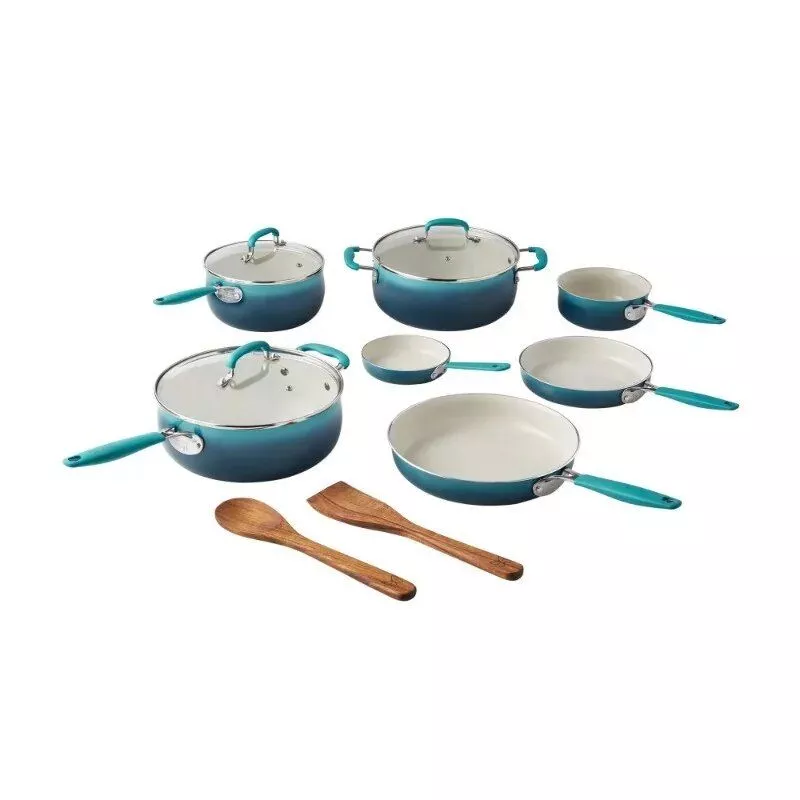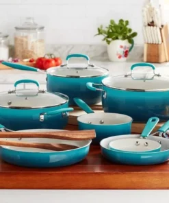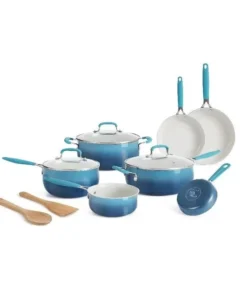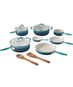 What sets this cookware apart is the stunning ombre design in vibrant teal, curated by Ree Drummond, a household name in home cooking. This set isn’t just about cooking; it’s about bringing style and elegance to your kitchen. The included acacia wood turner and ladle add a touch of rustic charm, aligning with Ree’s casual country style.