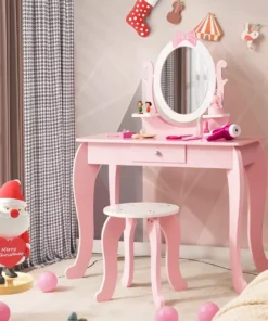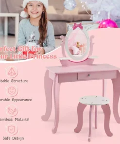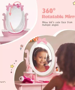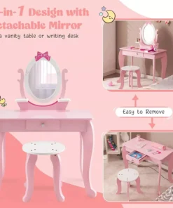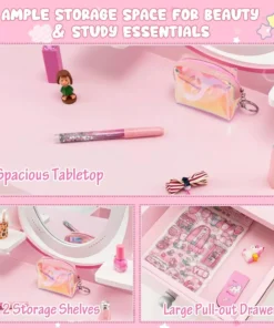 Our Kids Vanity Set stands out with its 360° rotating mirror, offering perfect views from every angle. The perfect height of 27.5 x 17 x 40 inches, with a tabletop at 22.5 inches, makes it just right for little ones. It’s not just a makeup table; with a detachable top, it transforms into a writing desk, providing dual functionality. The ample storage space, including a large drawer and open shelves, keeps essentials organized and within easy reach. Safety is paramount, with a sturdy wooden structure, non-toxic paint, rounded corners, and easy-to-clean surfaces, making it a worry-free choice for parents.
