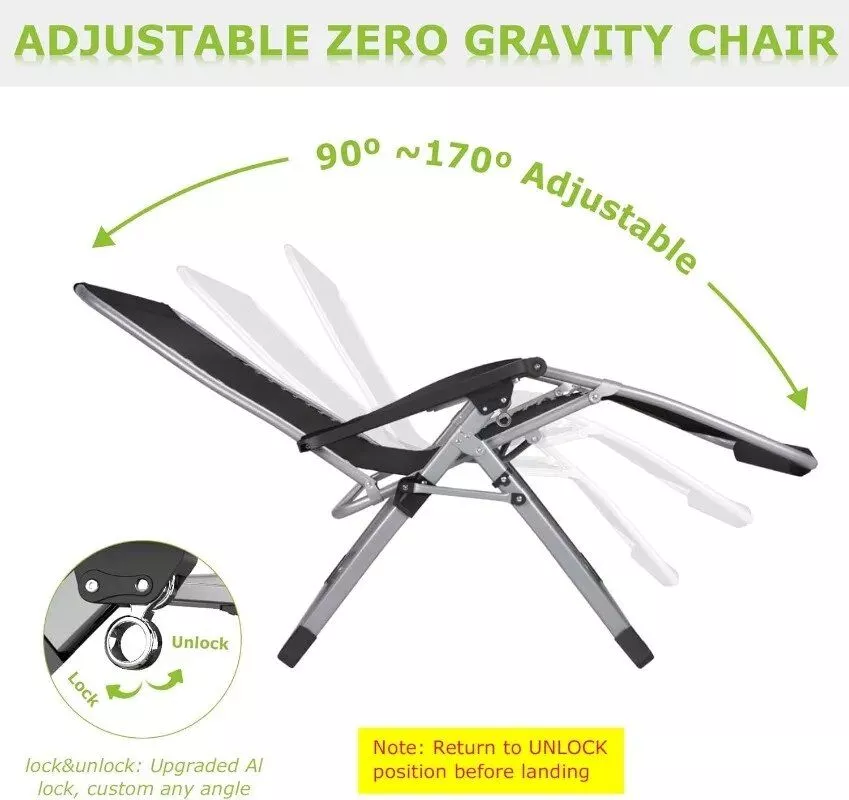 - Easy Adjustment and Locking Mechanism: Effortlessly adjust your recline from 90º to 170º with our third-generation aluminum alloy lock. A deeper groove ensures your chair stays locked in place, offering both safety and the perfect angle for relaxation.