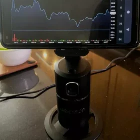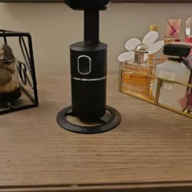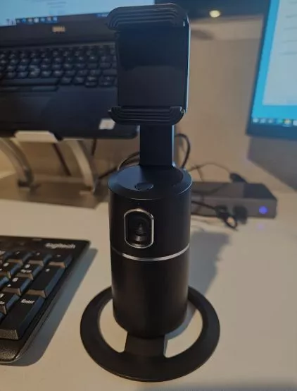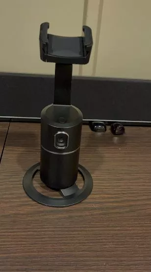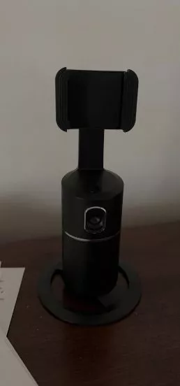 What an elegant little device! It operates by tracking your face, and I’m absolutely delighted with it. It’s quite responsive, though there’s a bit of a learning curve, but overall, it’s fantastic. It’s compact and sturdy, and it securely holds my phone in both portrait and landscape orientations, preventing any tipping over. Its compact size is a plus.