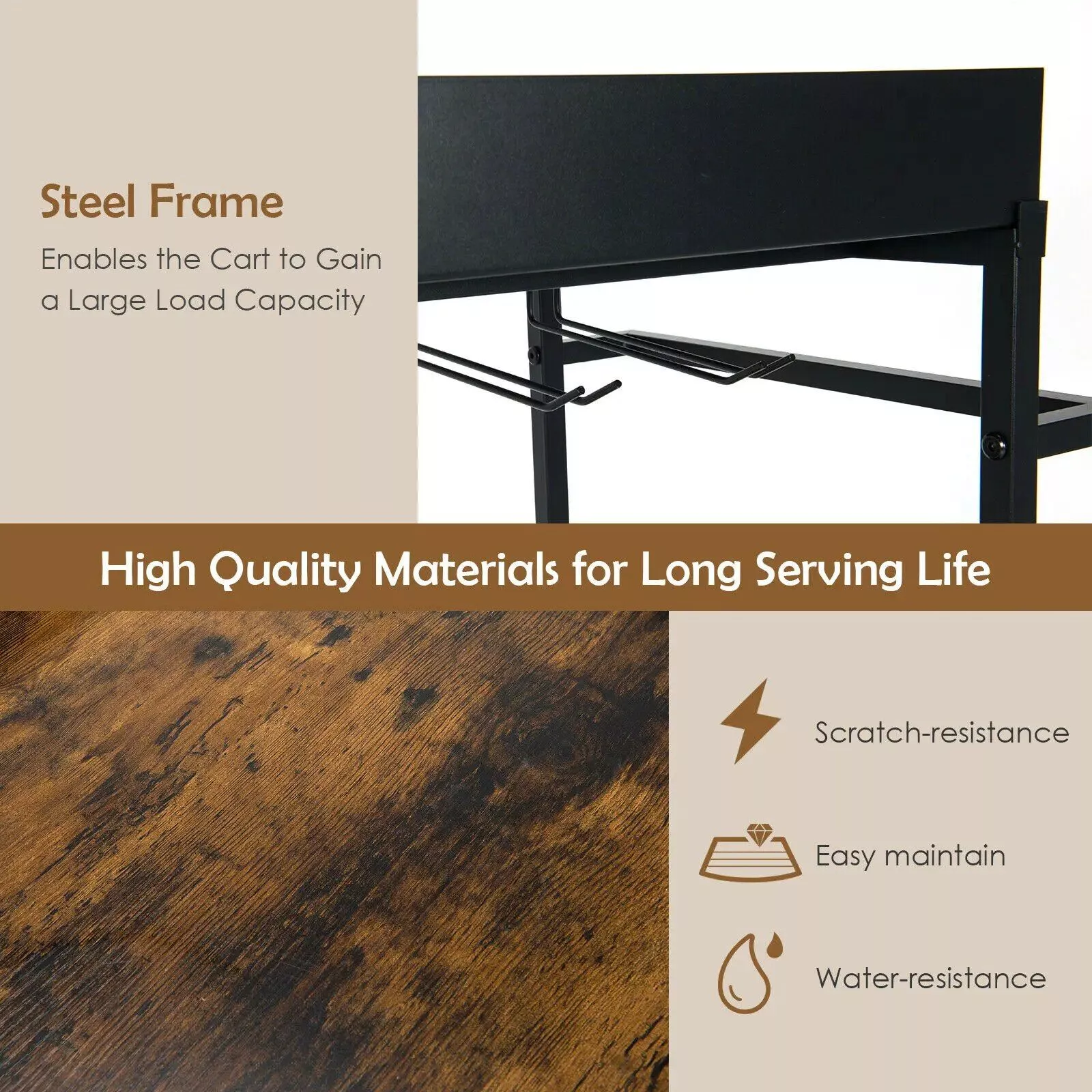 Revolutionize your home with our 4-Tier Rolling Kitchen Bar Cart, a masterpiece that blends functionality with chic industrial design. This multifaceted bar cart offers an innovative solution to your storage and serving needs, making it an indispensable addition to your kitchen, dining area, or home bar. With its rustic brown and black color scheme, it infuses a warm, inviting ambiance into any setting.