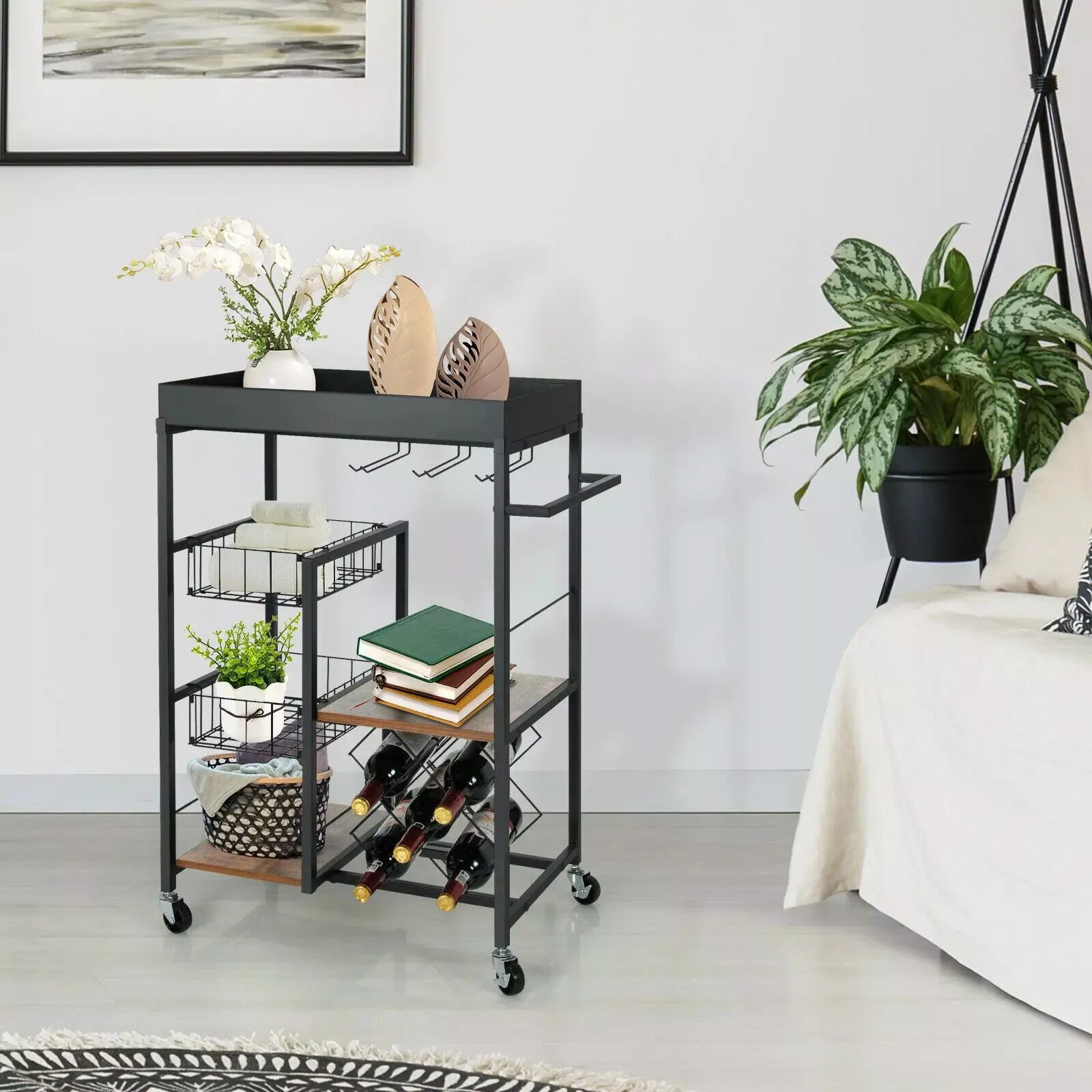 Our bar cart stands out with its well-thought-out design, featuring two spacious shelves, two mesh baskets, a dedicated 5-bottle wine rack, and a glass holder. Whether you’re storing your favorite vintages, organizing glassware, or keeping essentials at hand, this cart offers ample space. The highlight? A removable top serving tray with raised edges prevents spills, perfect for breakfast in bed or outdoor entertaining.