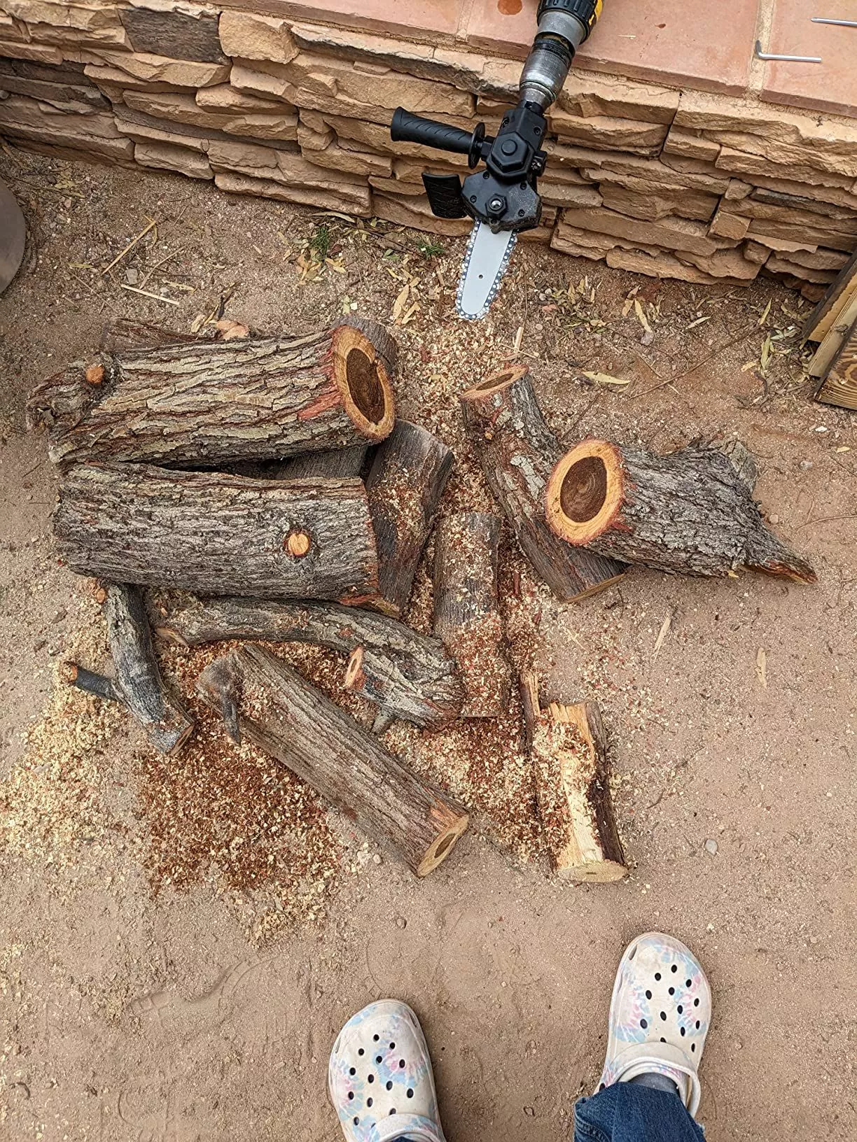I recently tackled some tough branches, nearly 6 inches thick, that were challenging for my usual saw. To my surprise, this tool effortlessly powered through them. I focused on cutting straight and let the chain do its work without any binding or getting stuck. Its short chain design is efficient, requiring minimal effort from the drill to operate. To ensure smooth operation, I made sure to generously lubricate all the moving parts and the central gearbox with oil.