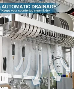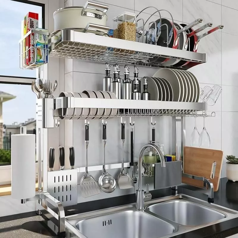 - Multifunctional Design: Incorporates a dish drying rack, pots and pans rack, cutting board holder, knife holder, utensil holder, cup holder, wrap holder, sink caddy, paper towel holder, and 5 utility hooks.