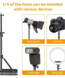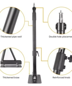 Our studio camera stand stands out with its robust build and versatile design. It’s more than just a stand; it’s a commitment to quality and efficiency in your creative work. The sleek black finish not only adds a professional look to your setup but also ensures that it blends seamlessly into any studio environment.
