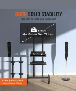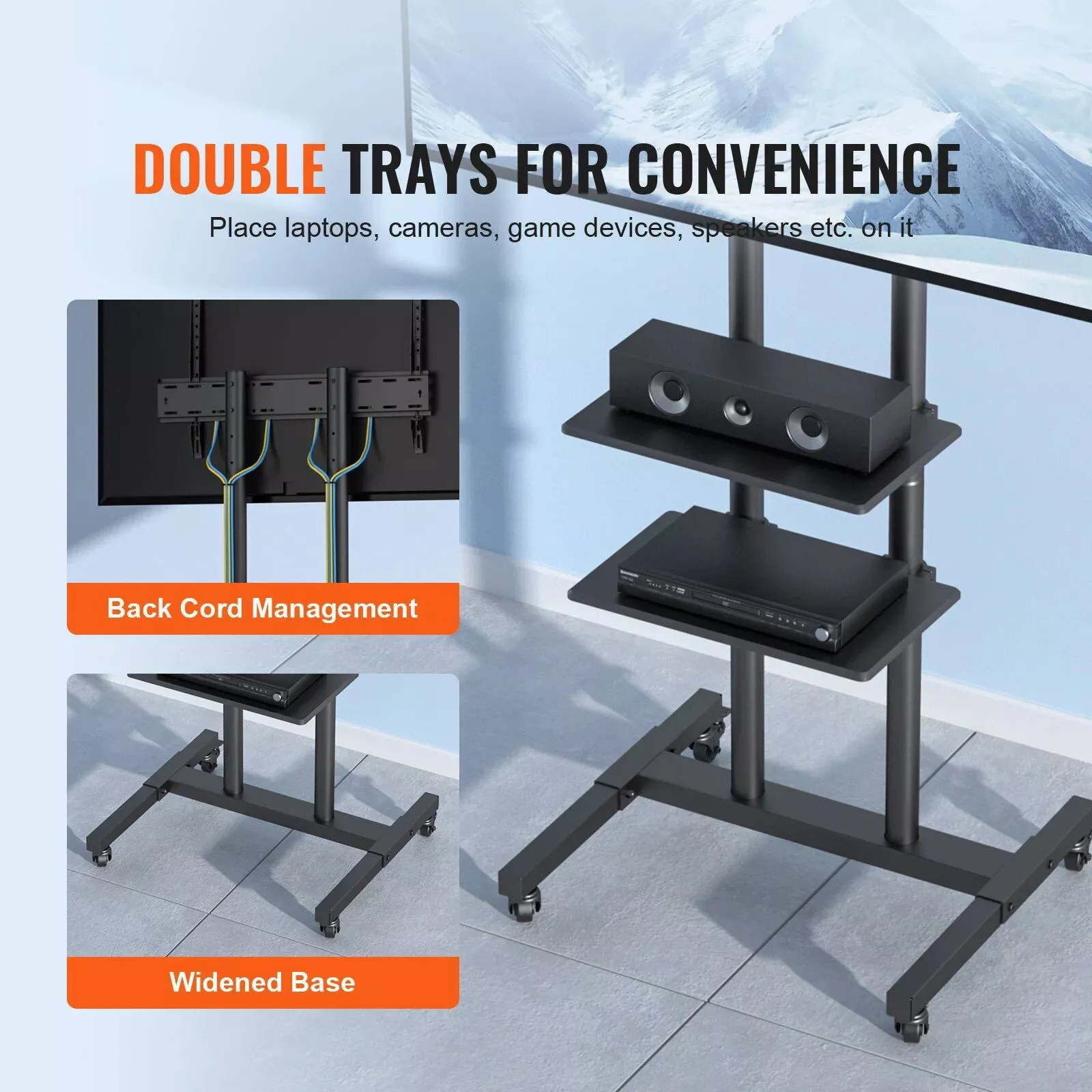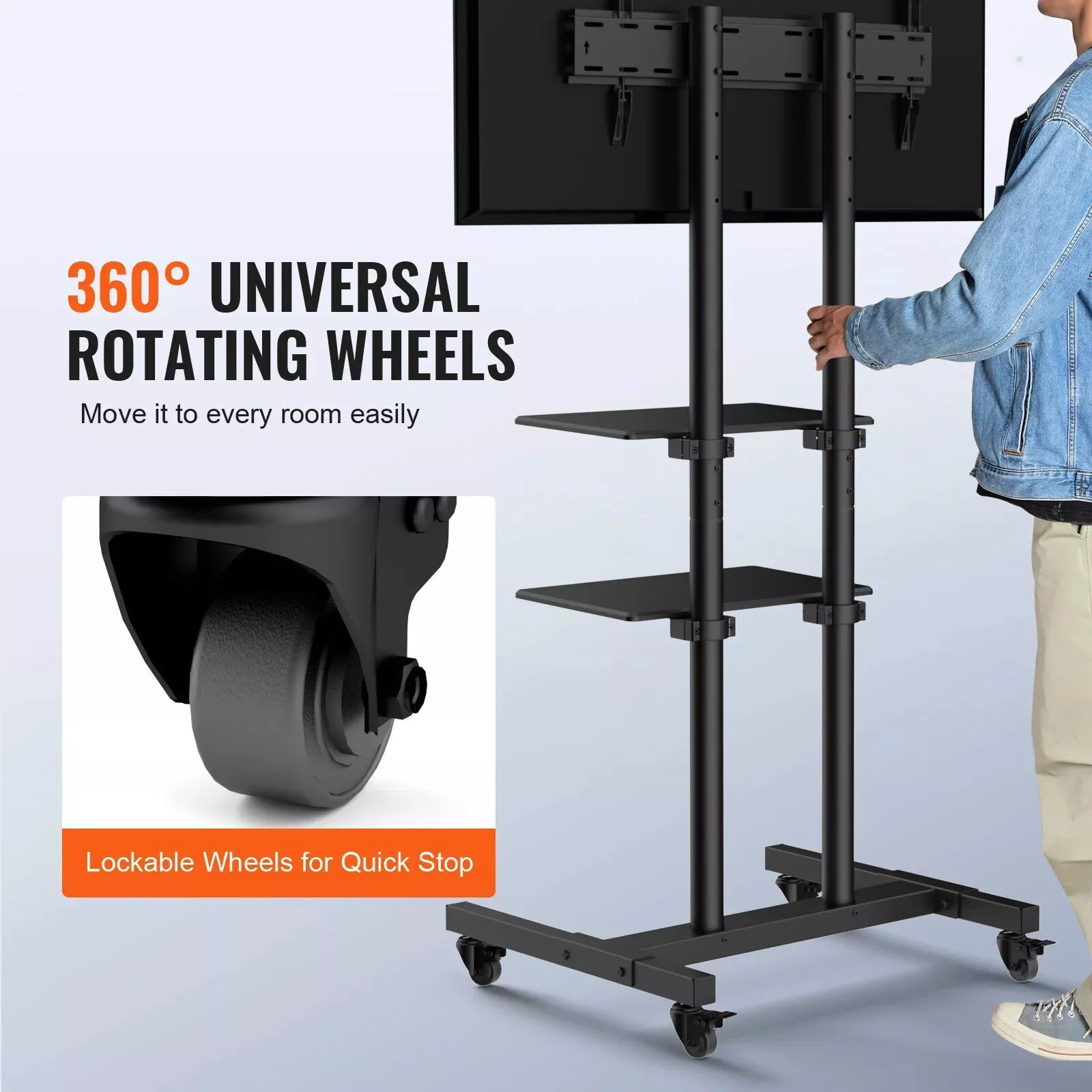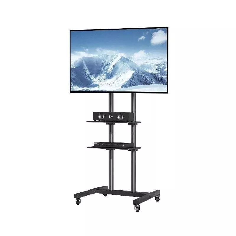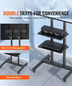 Our Mobile TV Stand is more than just a TV mount; it’s a versatile piece of furniture that enhances your multimedia experiences. Its non-suspension design eliminates the need for wall damage, making it ideal for renters or frequent redecorators. The double-layer trays offer convenient space for your audio-visual devices, ensuring everything you need is within reach. The stand’s easy assembly and freestanding design make it a practical choice for quick rearrangement and cleaning.