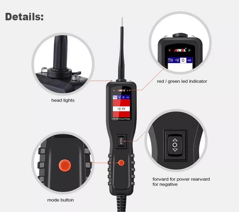 - Direct Battery Current Testing: Probe tip can carry positive or negative current for component testing.