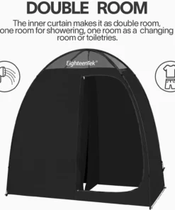 Say goodbye to flimsy construction and complicated setups. Our patented portable shower tent introduces a middle curtain, creating two separate rooms for added privacy. The double side zippers on the entrance doors provide easy access, while the black fabric ensures discreet use. Inside, discover a hanging rope and two mesh pockets for your convenience.