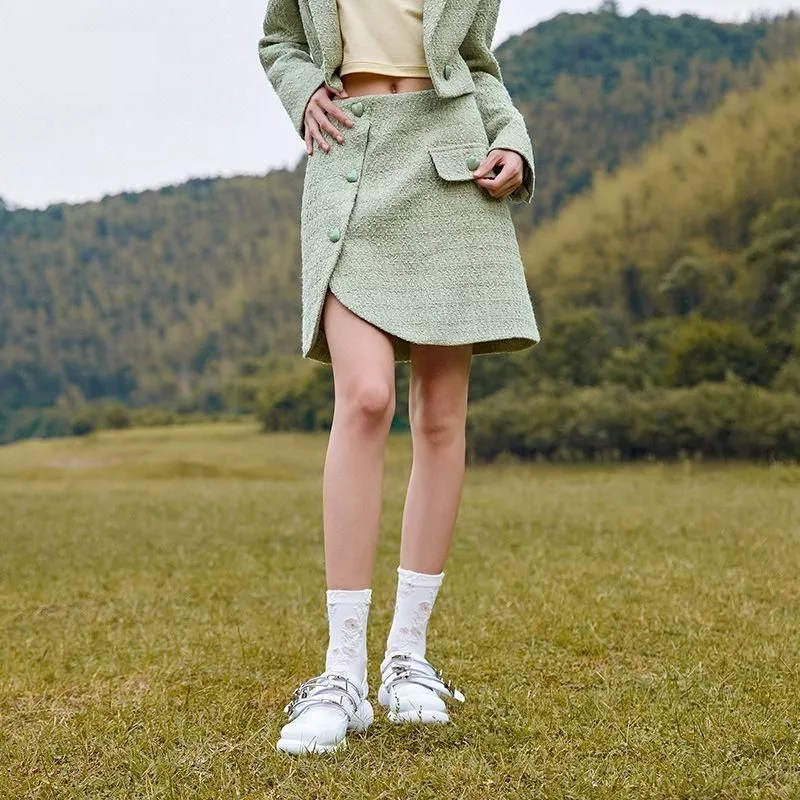 Our skirt boasts a high-quality blended fabric, ensuring both comfort and durability. The knee-length cut paired with a natural waistline offers a flattering silhouette for all body types. Its unique asymmetric design and tasteful button decoration add an edge to the traditional plaid pattern, making it a standout piece. Crafted with a non-stretch material, it provides a structured and elegant fit.