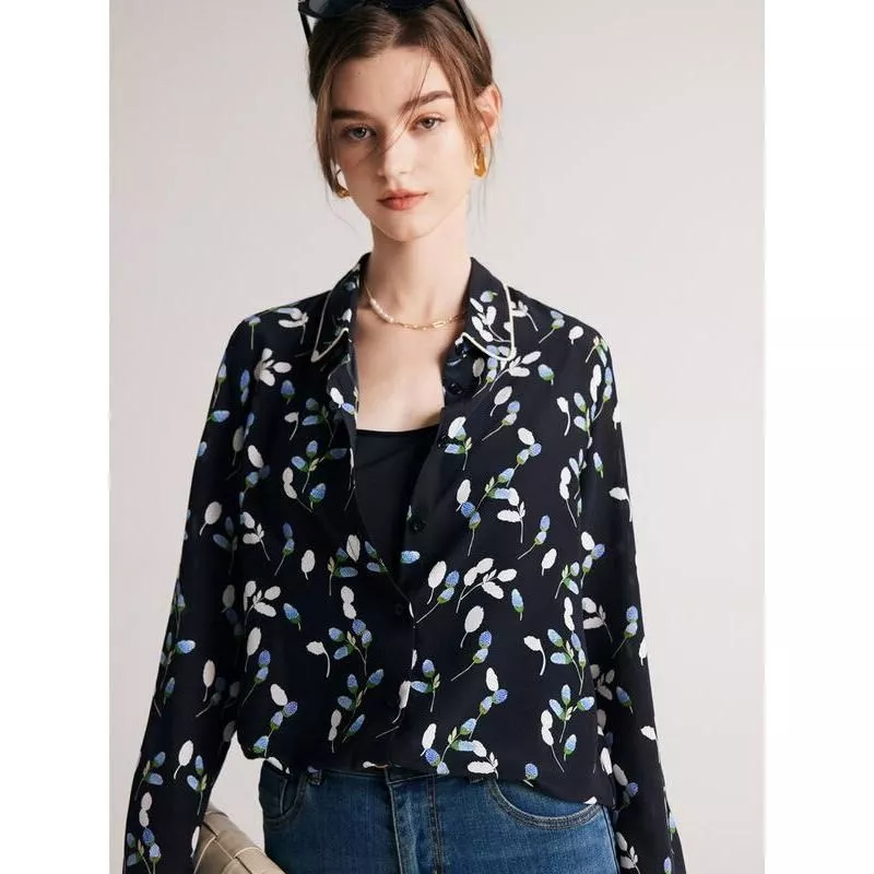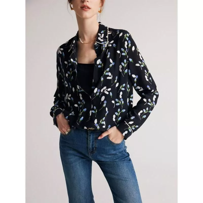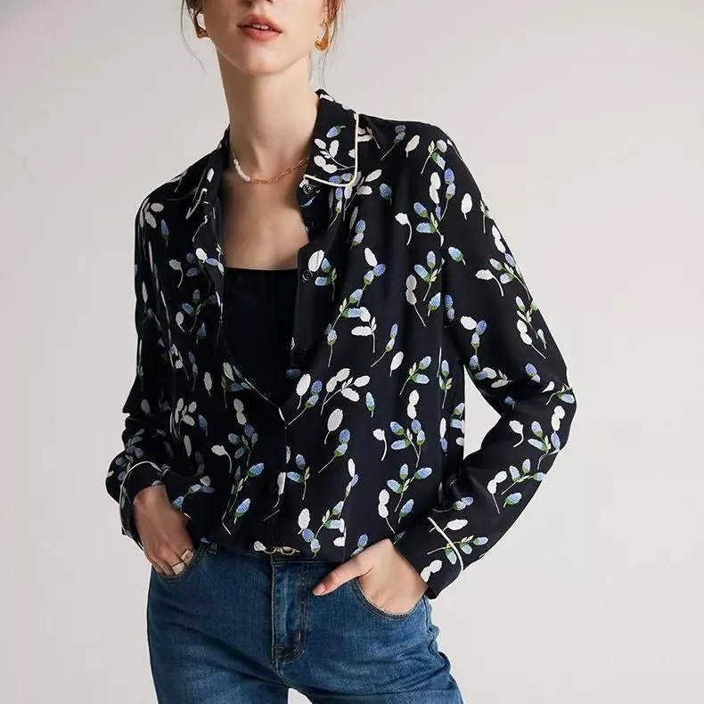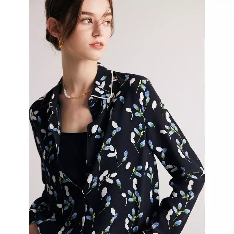 What sets this blouse apart is its commitment to quality and style. The 100% pure silk fabric is not only luxurious but also breathable, ensuring comfort throughout the day. The chic turn-down collar adds a touch of elegance, making it suitable for various occasions, from professional settings to casual outings. The sophisticated floral print is carefully designed to complement the navy base, creating an eye-catching yet elegant appearance.
