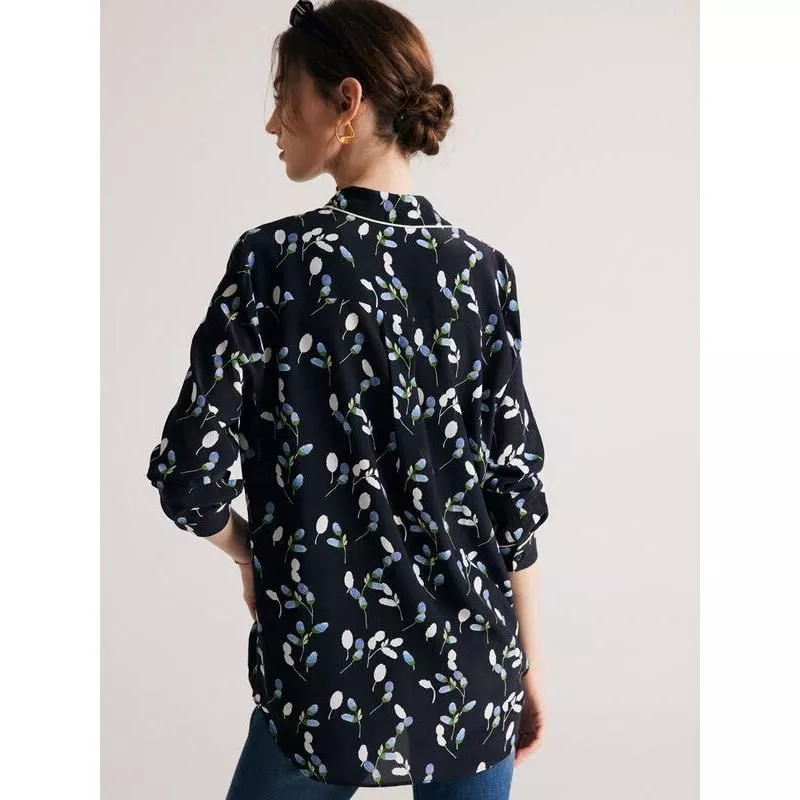Discover Elegance and Comfort with Our Chic Navy Floral Silk Blouse