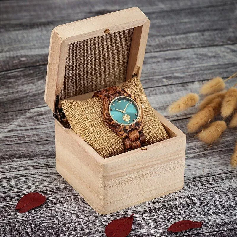 Every aspect of this watch reflects thoughtful design and quality craftsmanship. The 39mm dial diameter is sized perfectly for a feminine wrist, while the 12mm case thickness strikes the right balance between bold and sleek. The wooden band is both durable and stylish, extending up to 22cm in length and 20mm in width. The folding clasp with safety ensures the watch remains secure on your wrist. And though it’s not waterproof, its exquisite design and quartz movement make it a reliable and fashionable accessory.