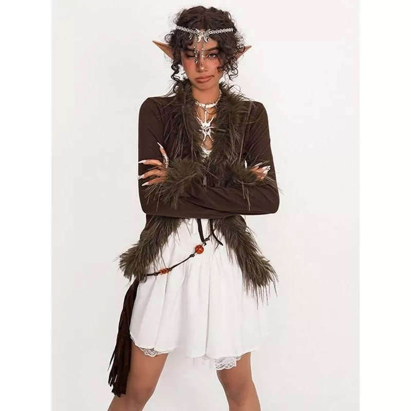 - Elegant lace-up V-neck and faux fur patchwork for a luxurious look.
