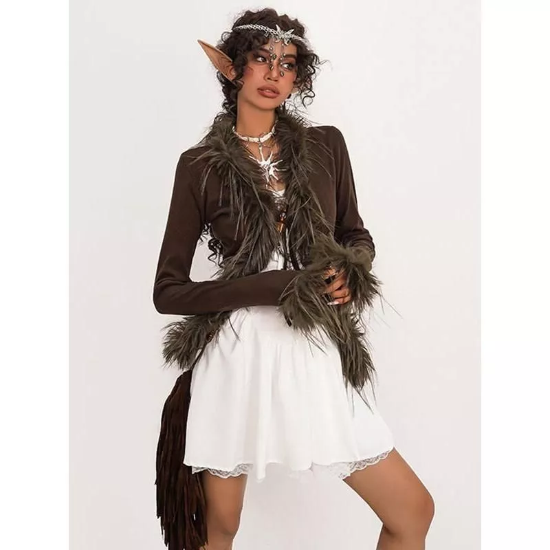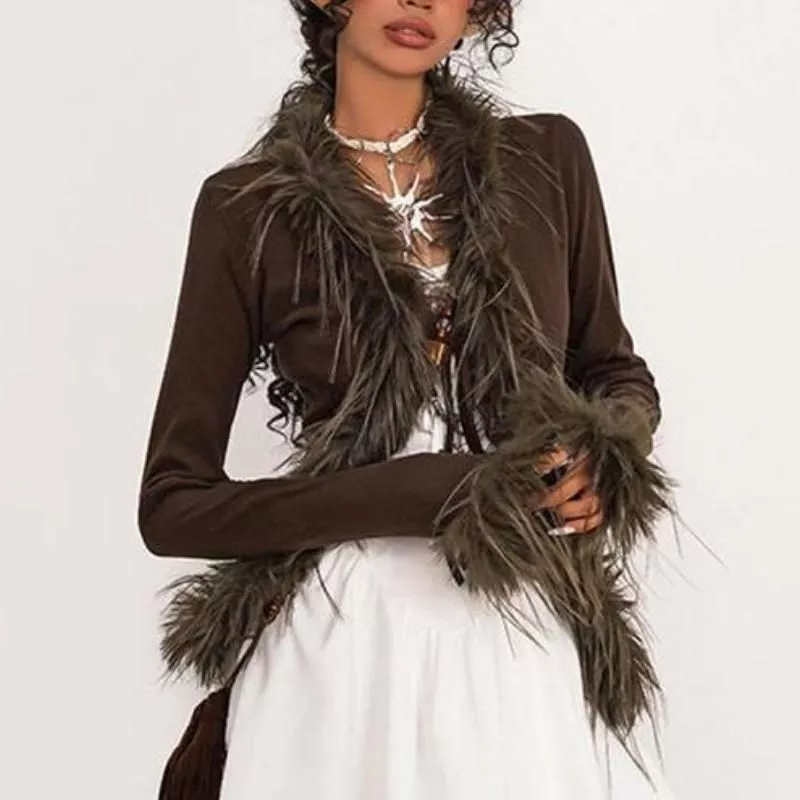 This cardigan boasts a unique lace-up V-neck, adding a touch of allure to the classic cardigan design. The faux fur patchwork provides a luxurious feel, while the slim fit silhouette ensures a flattering look for any body type. Made from high-quality polyester, it offers both durability and comfort. Its full sleeves and standard thickness make it ideal for those breezy spring days or cool summer evenings.