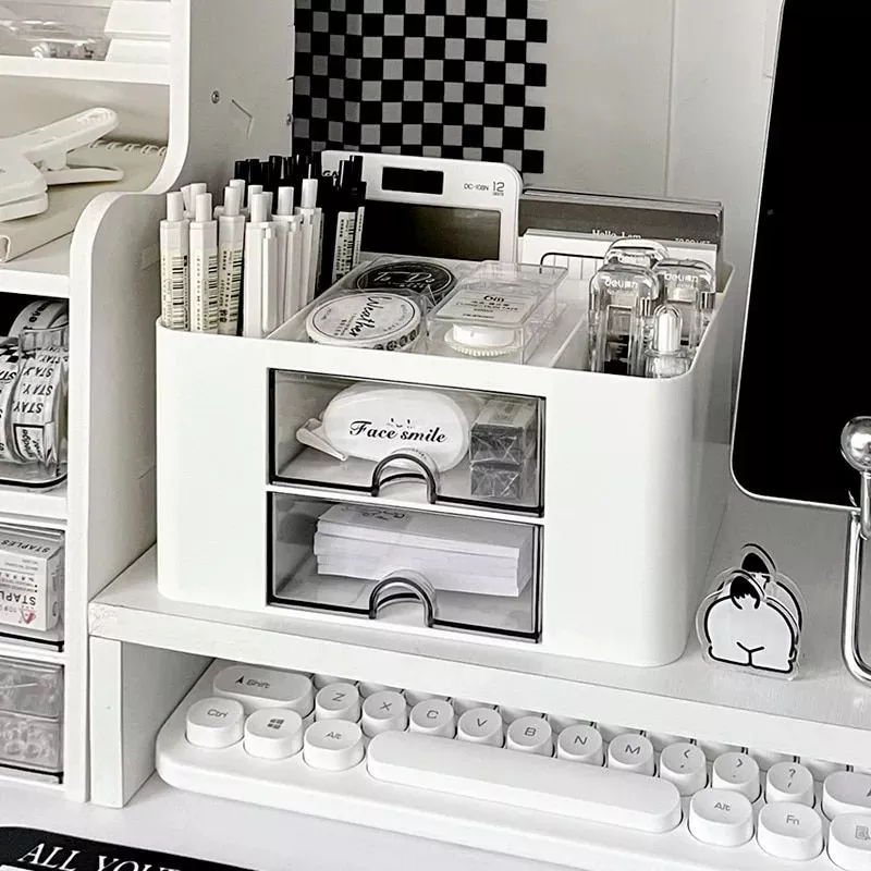 Not just any pen holder, this organizer boasts a large capacity with 2 drawers that double as a multifunctional storage box. It’s a versatile gem that accommodates more than just stationery; use it to store makeup, cables, and other small items that tend to create a mess. The clear design invites a minimalist charm while allowing you to see the contents at a glance, making it a practical and stylish centerpiece of your desk.