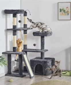 Introducing the ultimate haven for your feline friend – our Deluxe Multilevel Plush Cat Tree. Designed with your cat’s playfulness and comfort in mind, this activity tower in a stylish dark gray hue promises to be the purr-fect addition to your home. Whether they’re in the mood to explore, scratch, or simply relax, this cat tree offers it all.