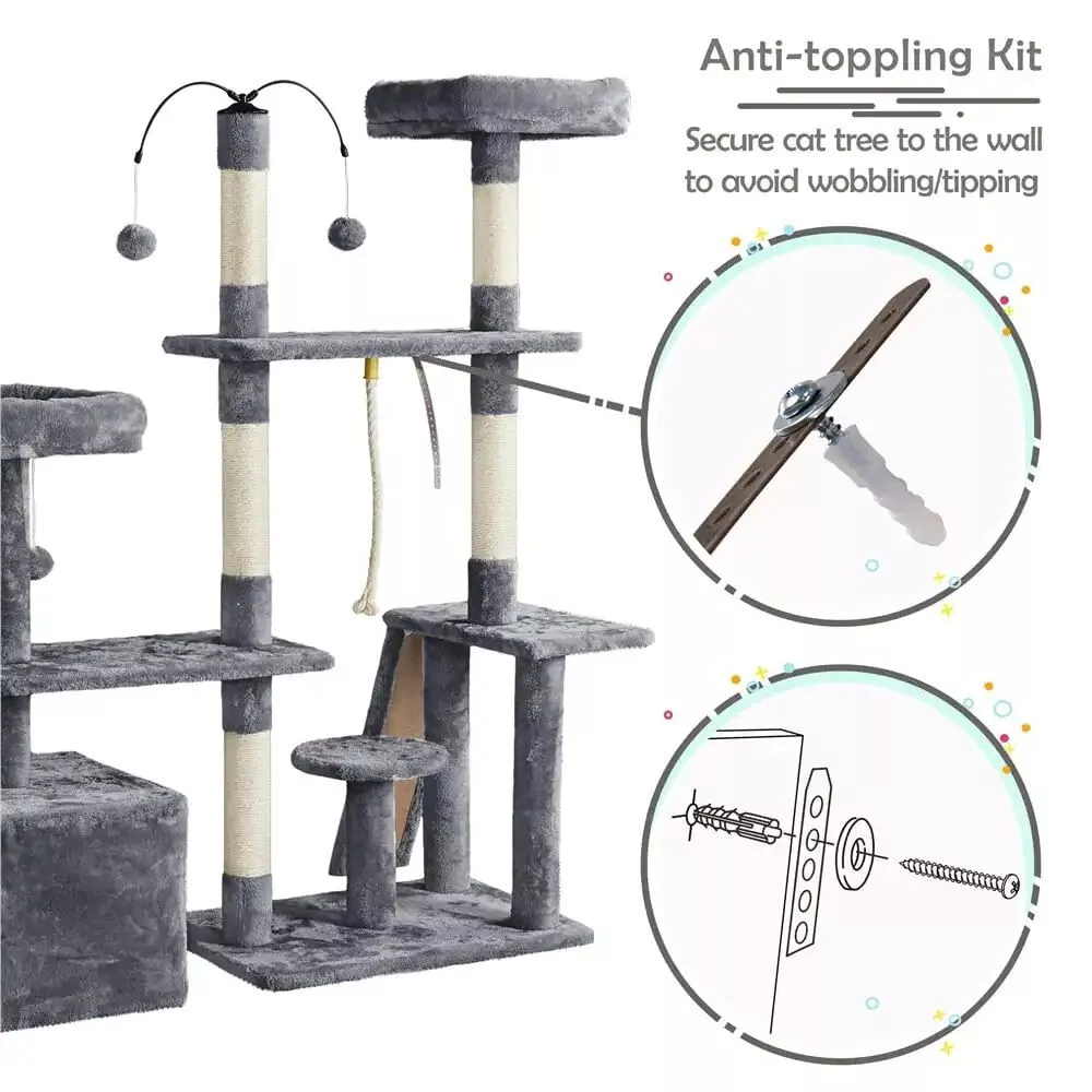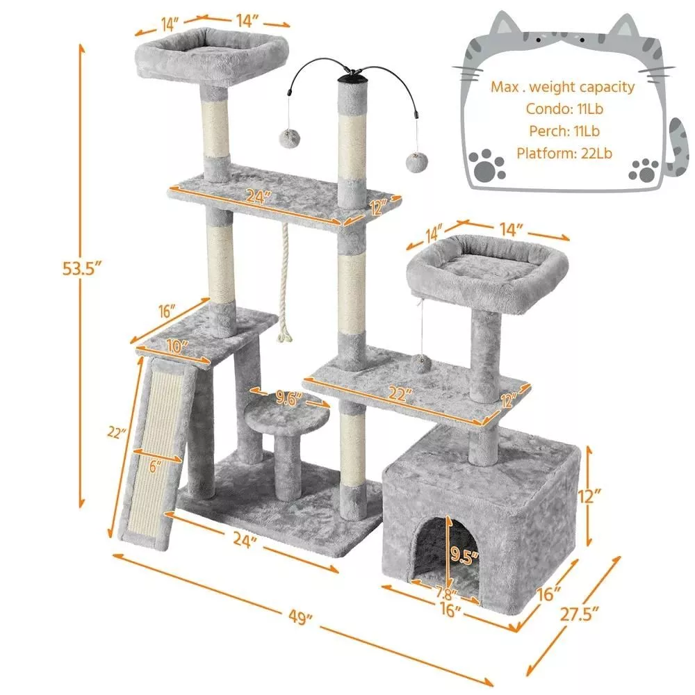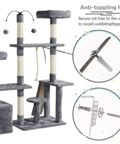 Our cat tree is uniquely crafted to cater to your cat’s natural instincts. It features a flexible structure that can be adjusted to an L-shape, fitting seamlessly into various spaces in your home. The soft plush covering provides a gentle touch for your cat’s paws, while the natural sisal ropes on the scratching posts and board ensure durability and a satisfying scratch. Elevated perches offer your cat a high vantage point to survey their kingdom, and the cozy condo is perfect for a peaceful retreat. Plus, the two dangling, rotatable balls add an element of playful surprise.