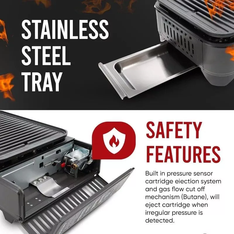 - Enhanced Safety. Equipped with a built-in Pressure Sensor Cartridge Ejection System and Gas Flow Cut Off Mechanism for butane, plus flame supervision for propane use, ensuring your cooking experience is safe and reliable.