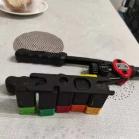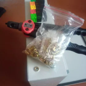 One nozzle was already installed, so don’t worry if one container is empty. The tool looks good and seems like it will last with careful use. I tried riveting a steel M8 rivet, and the effort required was moderate.