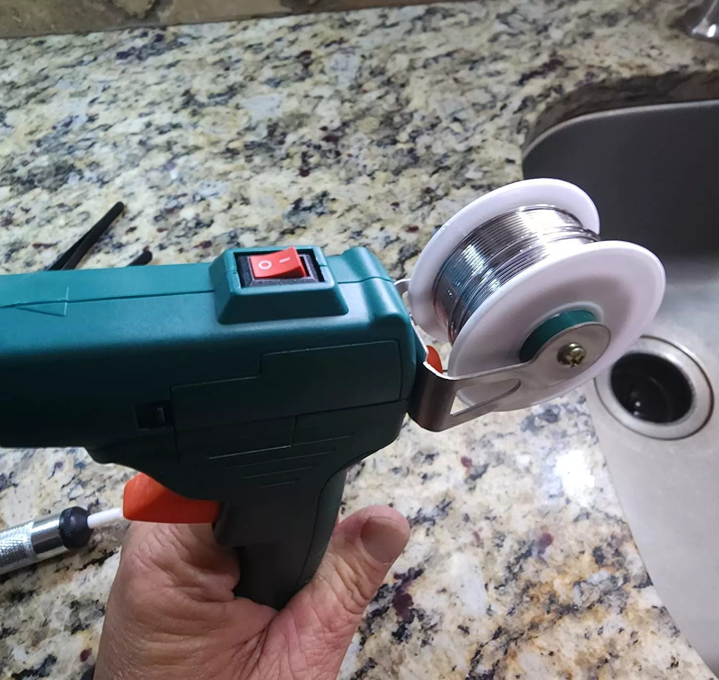 A one-handed soldering gun is a good idea but this one needs more work. I couldn’t get the solder to come out right and it was hard to put the solder in. It heats up okay, but I like using a regular soldering gun better.