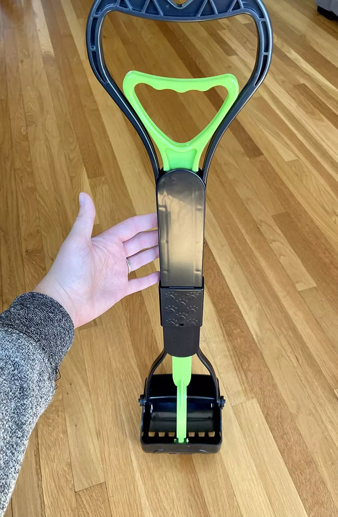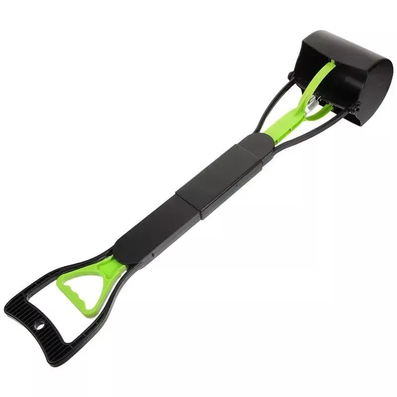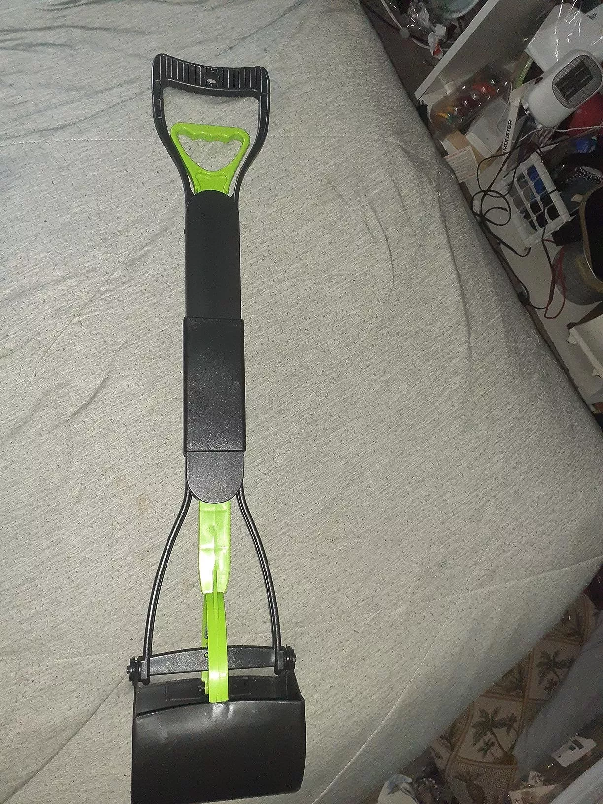 This pooper scooper has fulfilled my expectations after months of use. Squeezing the handle to open the jaws is effortless, and it effectively picks up and holds a considerable amount. The sturdy spring and handle have proven durable, and the green color adds a fun touch. The folding feature, though not utilized, adds to its versatility.
