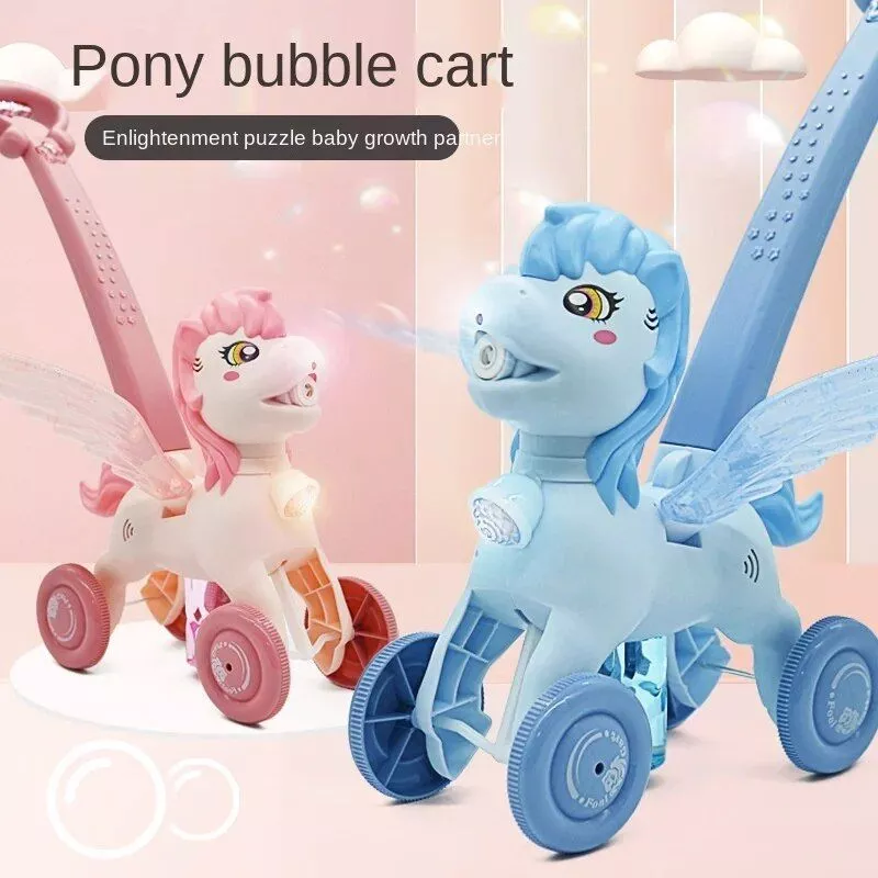Introducing our Electric Unicorn Bubble Cart, designed to turn any playtime into a dreamy, bubbly wonderland! Witness the magic as your child pushes this delightful toy, releasing a myriad of bubbles, accompanied by enchanting melodies and twinkling lights. A mesmerizing experience tailored for children, sure to light up their eyes and their imaginations.