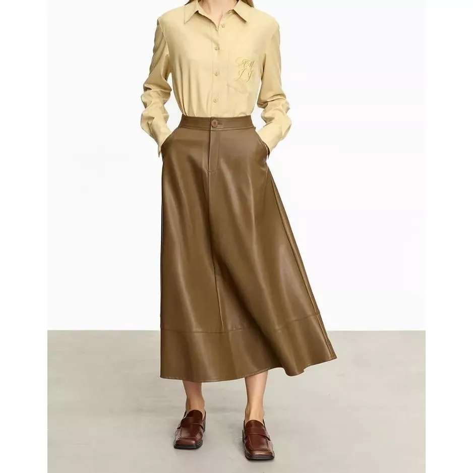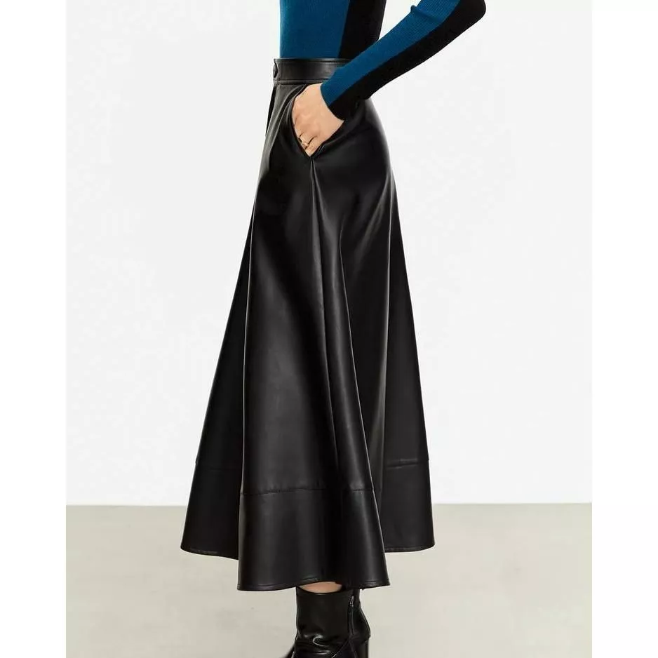 Embrace the essence of autumn style with our Elegant Autumn Ankle-Length A-Line Leather Midi Skirt. Designed for the modern woman who appreciates simplicity with a touch of sophistication, this skirt is a must-have for your autumn and winter wardrobe. Its classic A-line silhouette and solid color pattern make it a versatile piece for various occasions, whether for office wear or casual outings.
