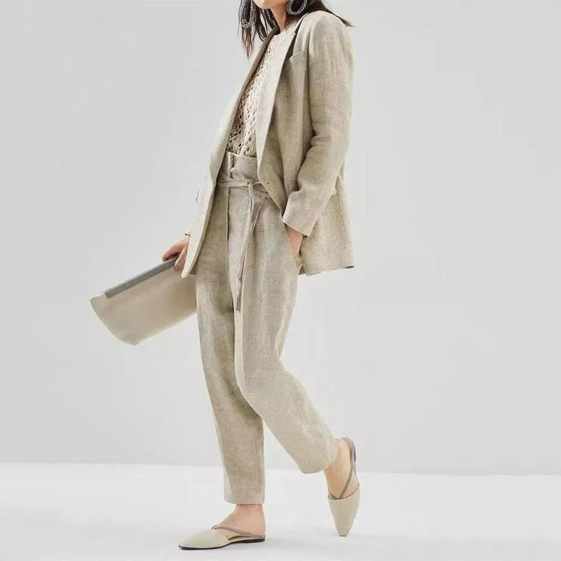 Our set stands out with its high-quality cotton linen fabric, ensuring both comfort and durability. The single-button, straight notched long sleeve blazer paired with lace-up long pants offers a flattering and versatile look. The pants feature a high waist and regular fit, providing a comfortable yet stylish silhouette.
