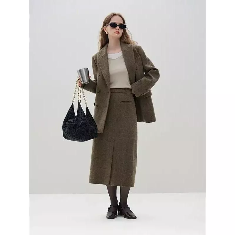 Introducing our newest addition to your winter wardrobe: the Elegant Wool Blazer Skirt Set for Women. Exclusively designed for the modern, middle-aged woman who appreciates classic style with a contemporary twist. This set, featuring a double-breasted wool jacket and a front-split long wool skirt, is perfect for office wear or upscale social events. Crafted from 100% high-quality wool, this ensemble promises not only style but unparalleled comfort during the chilly winter season.