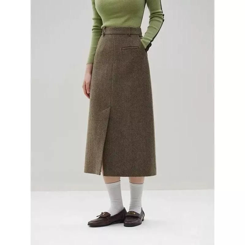 - Skirt: Elegant long wool skirt with a stylish front split.