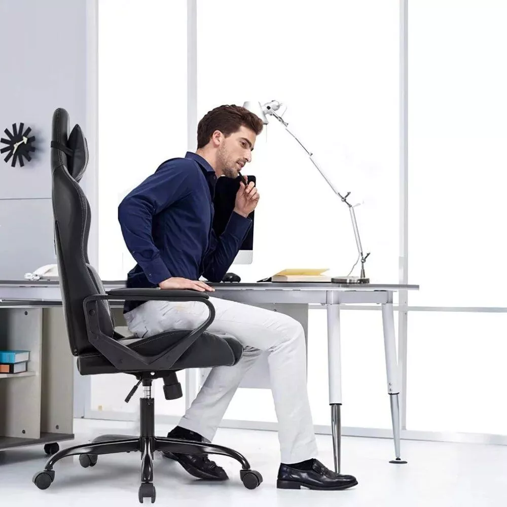 Experience unmatched comfort and support with our Ergonomic High-Back Gaming & Office Chair, designed for prolonged hours of gaming or office work. This chair is generously cushioned and covered in breathable premium PU leather, ensuring you stay comfortable during long sessions. With adjustable lumbar support and a headrest pillow, your spine and neck are protected, enhancing your overall posture. The adjustable reclining feature allows you to lock in any position from 90-135°, ensuring you find your perfect angle for relaxation or concentration.