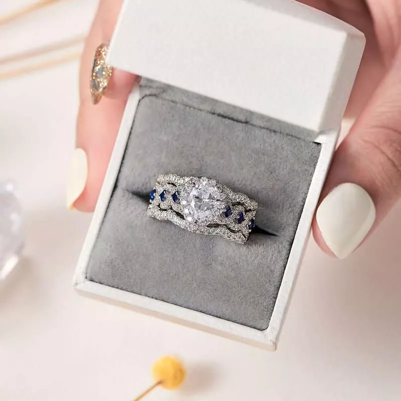 Each ring in this set is meticulously designed with 75 AAAAA cubic zirconia stones, totaling 3.0 CTTW. The smooth prong setting keeps the main stones secure and comfortable, ensuring a stunning yet easy-to-wear experience. The rings feature an additional touch of luxury with 8 small AAAAA blue sapphire gemstones, adding a pop of color and uniqueness to the set.