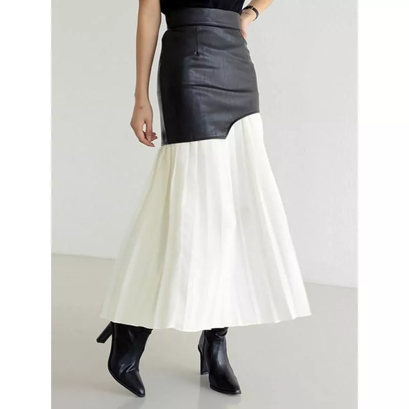 Unleash Your Fashion Forward Spirit with Our Long Leather Patchwork Pleated Skirt!