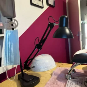 As a hobbyist and side hustler making press-on nail sets, I needed a good, adjustable lamp for my work area. I appreciate that it’s not bulky and has a clamp, allowing me to use ample table space for all my supplies. After reading reviews about the power switch on the cord, I ordered LED bulbs controllable via my phone or remote, hiding the cord behind my desk while still easily managing on/off, warmth, and brightness.