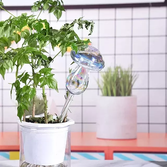 These mushroom-shaped watering globes are not only pretty but also functional. I absolutely love them!
