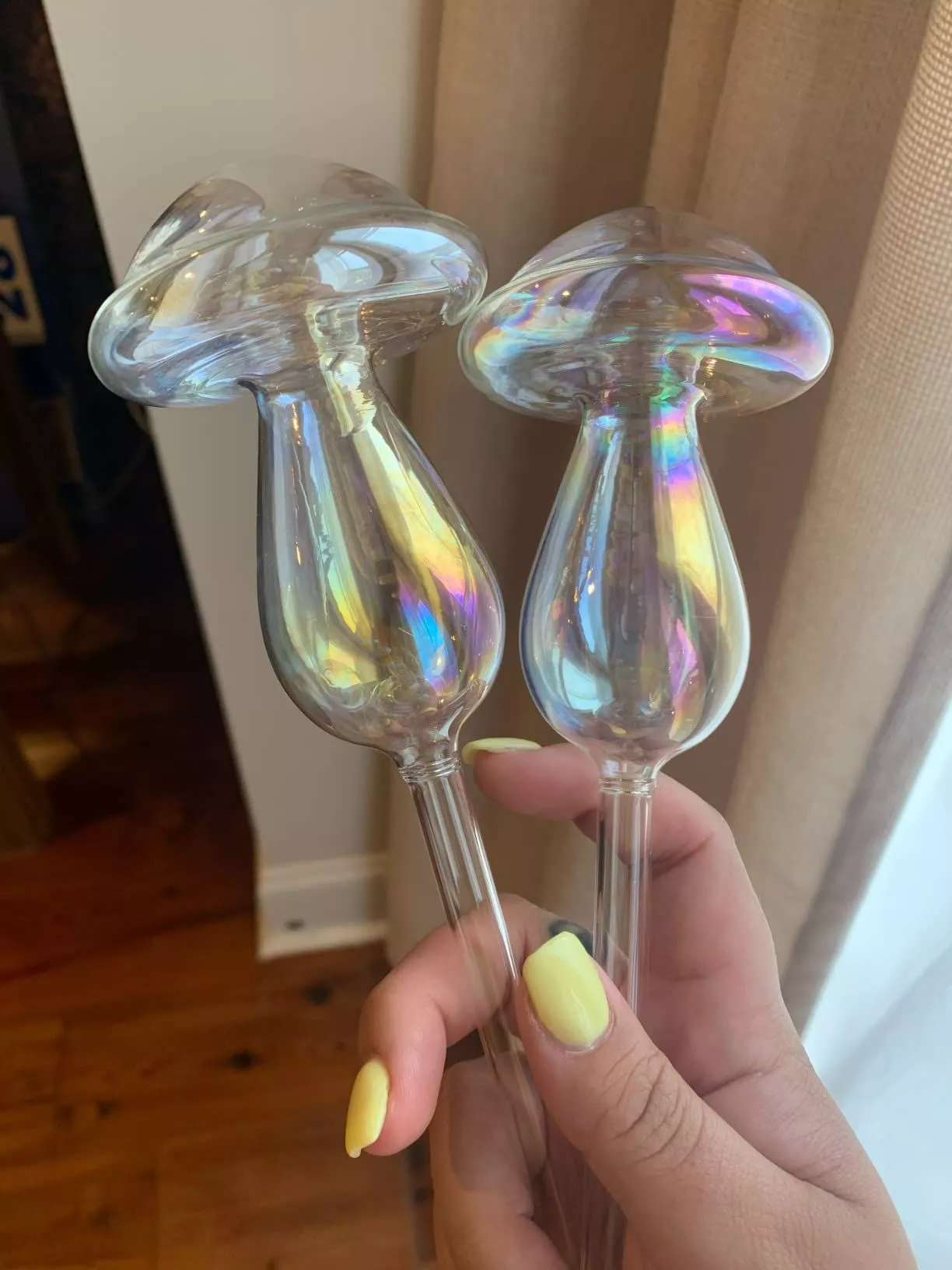 The mushroom water globes were delivered quickly and were well-packaged. They’re pretty, with an iridescent sheen, and hold about a cup of water.
