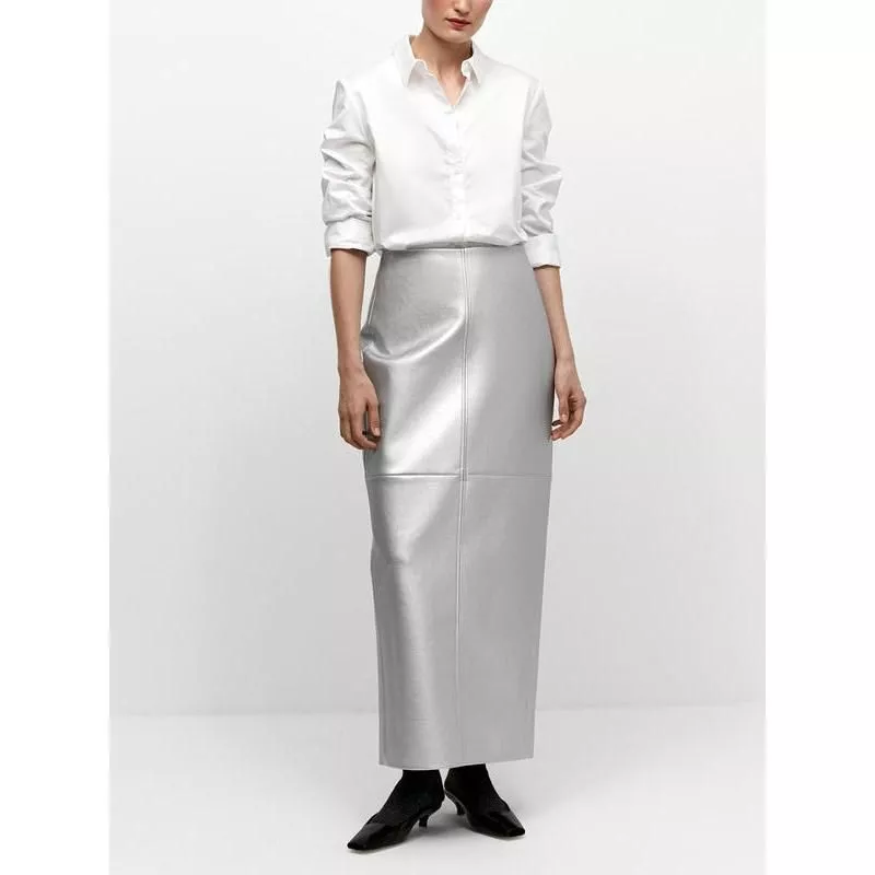 Crafted with meticulous attention to detail, this skirt features a sleek A-line silhouette that flatters your figure while providing a comfortable fit. The eye-catching gold tone adds a touch of luxury and sophistication to your outfit. The ankle-length cut ensures elegance in every step, complemented by a stylish button decoration that enhances its visual appeal.