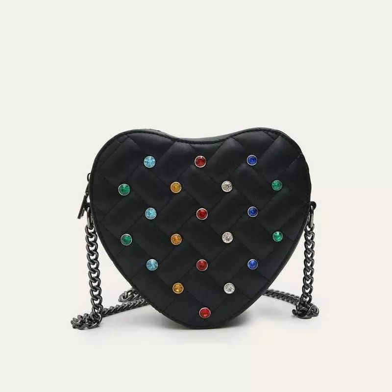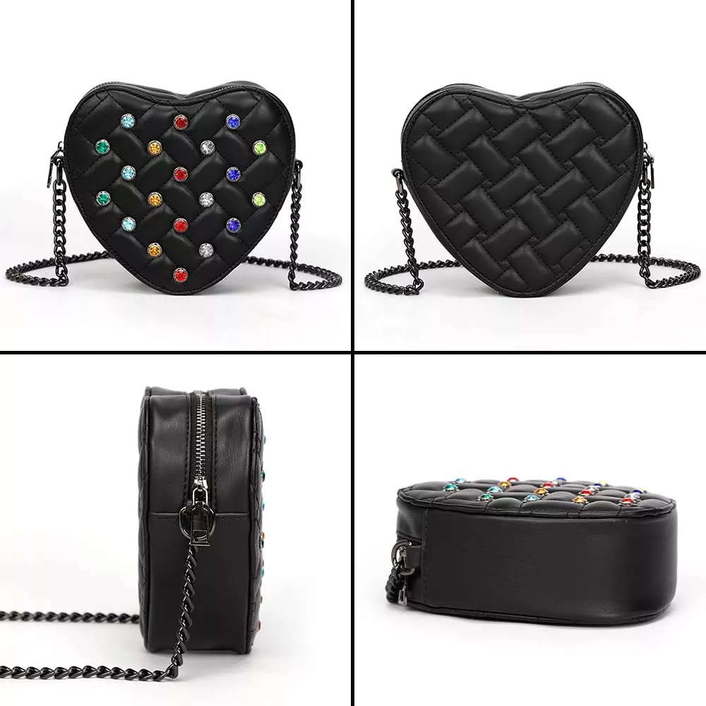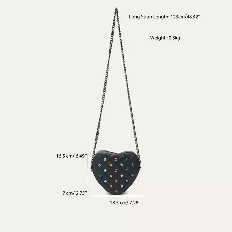 Our Heart Shaped Crossbody Bag stands out for its unique design, combining fashion with functionality. The colorful rhinestone quilted chain adds a luxurious touch, setting it apart from ordinary handbags. The PU vegan leather ensures durability and a guilt-free fashion experience, aligning with modern ethical standards. This bag is not just an accessory; it’s a statement of your commitment to style and sustainability.
