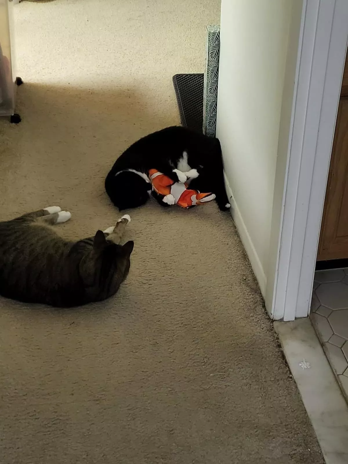 The cat sits on it, plays with it, then jumps away, scampering around, totally spooked by this realistic-looking fish! It’s a delight to watch!