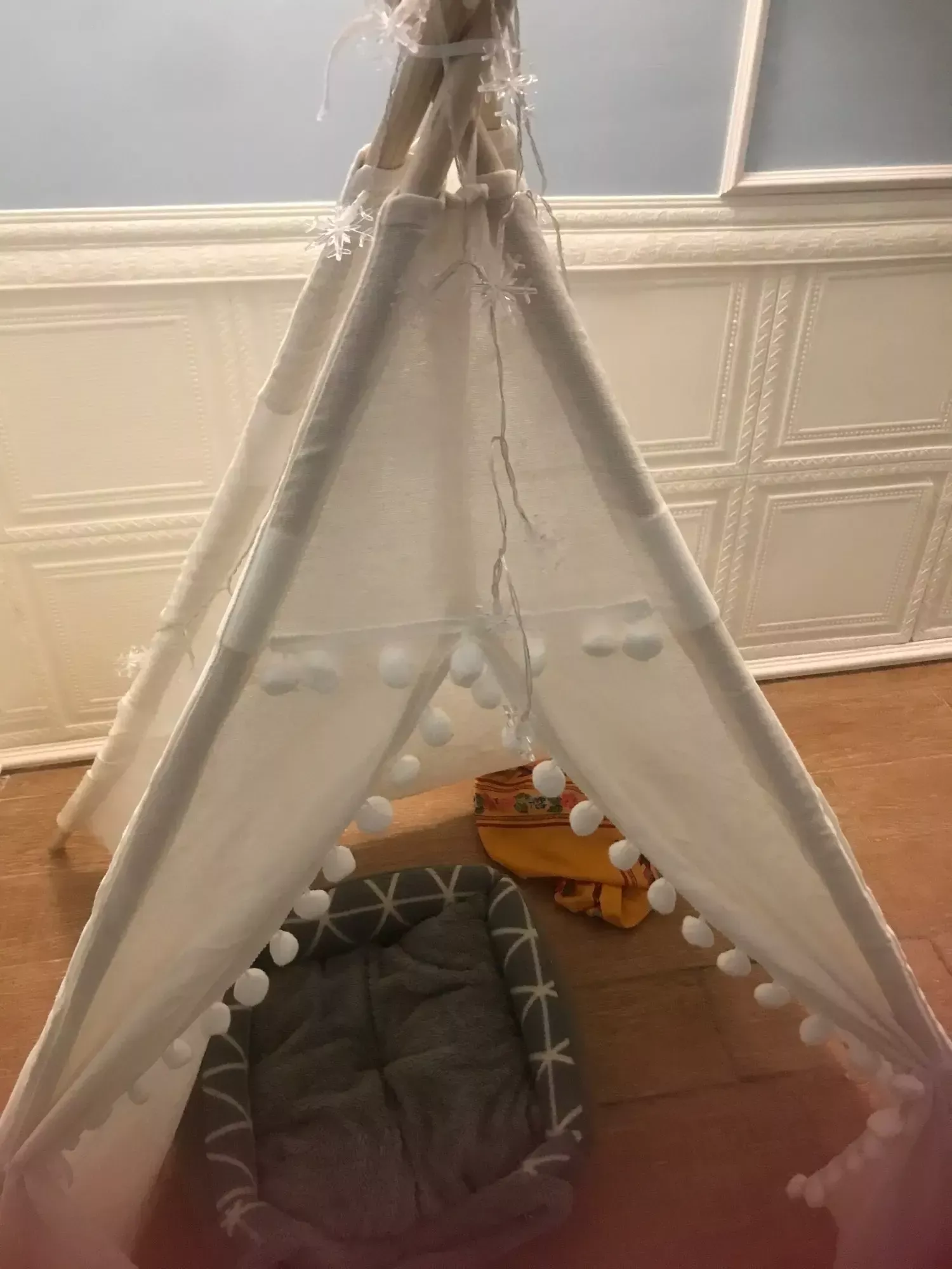 I bought this for my dog to replace his crate with a cozy den. It’s perfect for him at 60 lbs and adds a cute touch to the room.