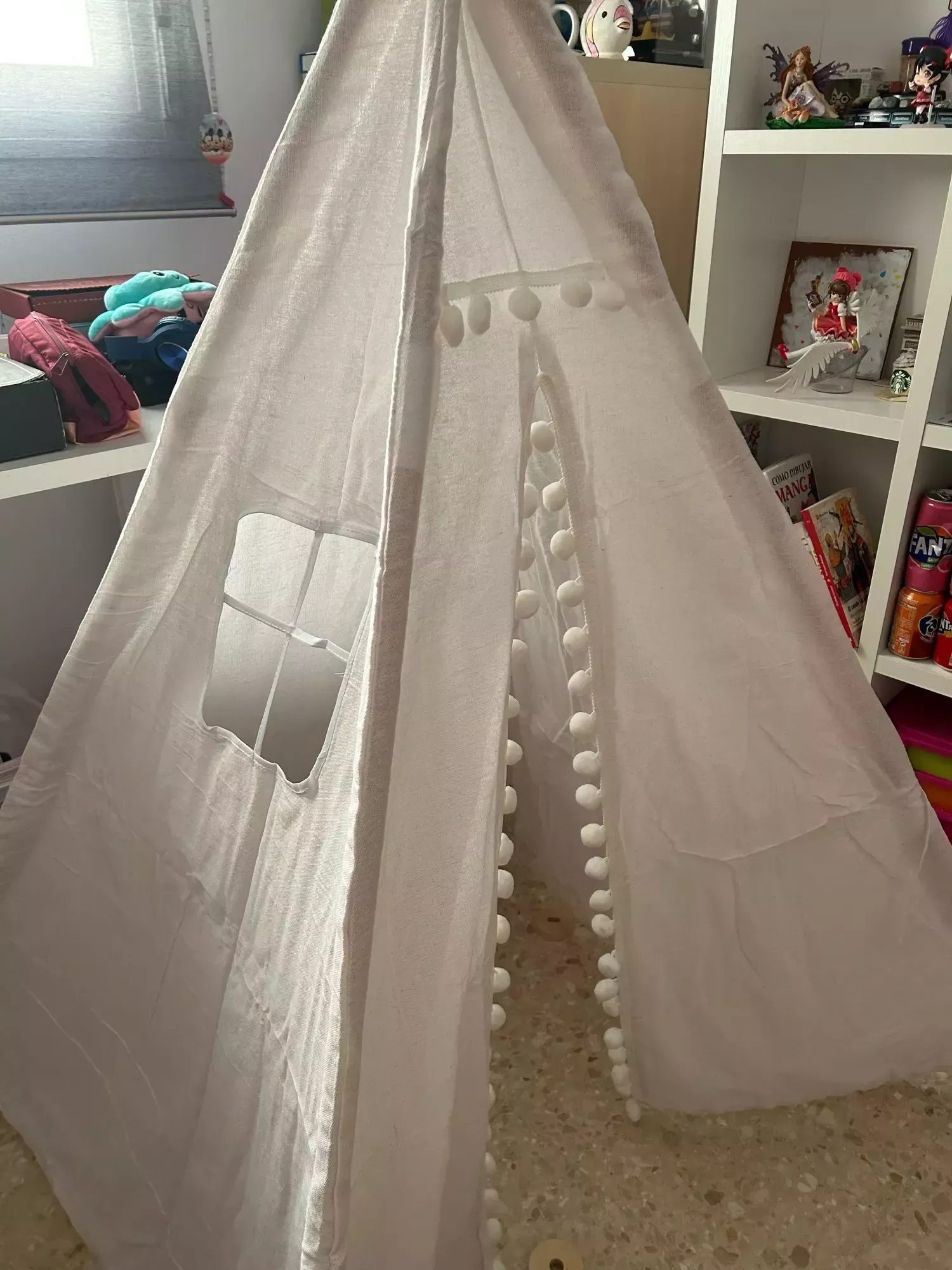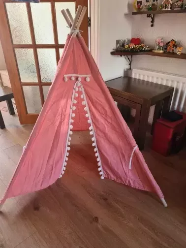 The tent is adorable, with a good size and vibrant color. I decorated it with stars, and my little girl adores it. However, it lacks stability and tends to fall if moved too much.