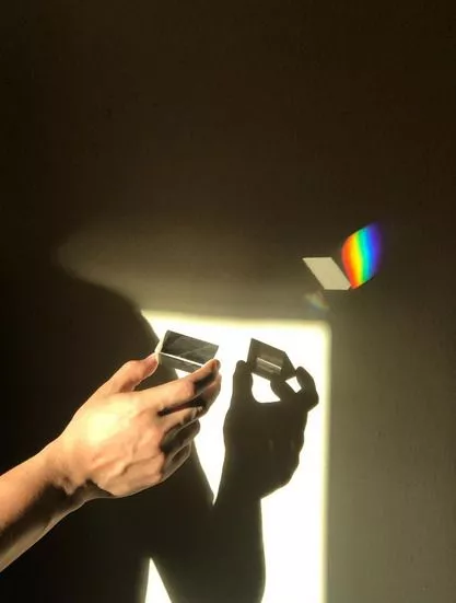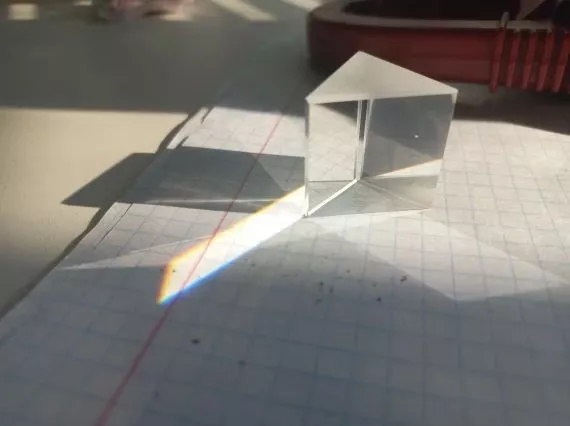 I tutor a 14-year-old boy in eighth grade, and his science class is struggling. I purchased these prisms to demonstrate sunlight refraction. With the Sun behind me, I placed the prism over my shoulder and projected the spectral display onto the shadow in front of me. It was beautiful – violet, blue, green, yellow, and red.
