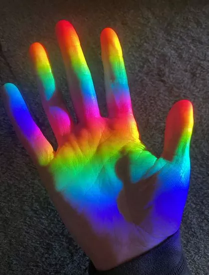 When I looked out the window through the prism, I was able to see multiple rainbows inside it, each spanning the entire length of the prism, with several rainbows stacked beneath one another.