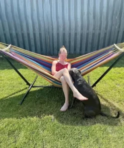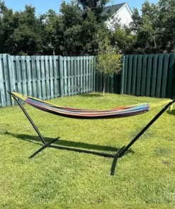 Imagine a tranquil retreat in the comfort of your own backyard, garden, or any outdoor space, transformed into a haven of relaxation with our Luxurious Double Hammock. Crafted with a nod to Brazilian style, this hammock features eye-catching color stripes that blend seamlessly with its sleek black steel stand, promising not only a brilliant aesthetic but a unique floating sensation that mimics the gentle sway of a boat on calm waters.
