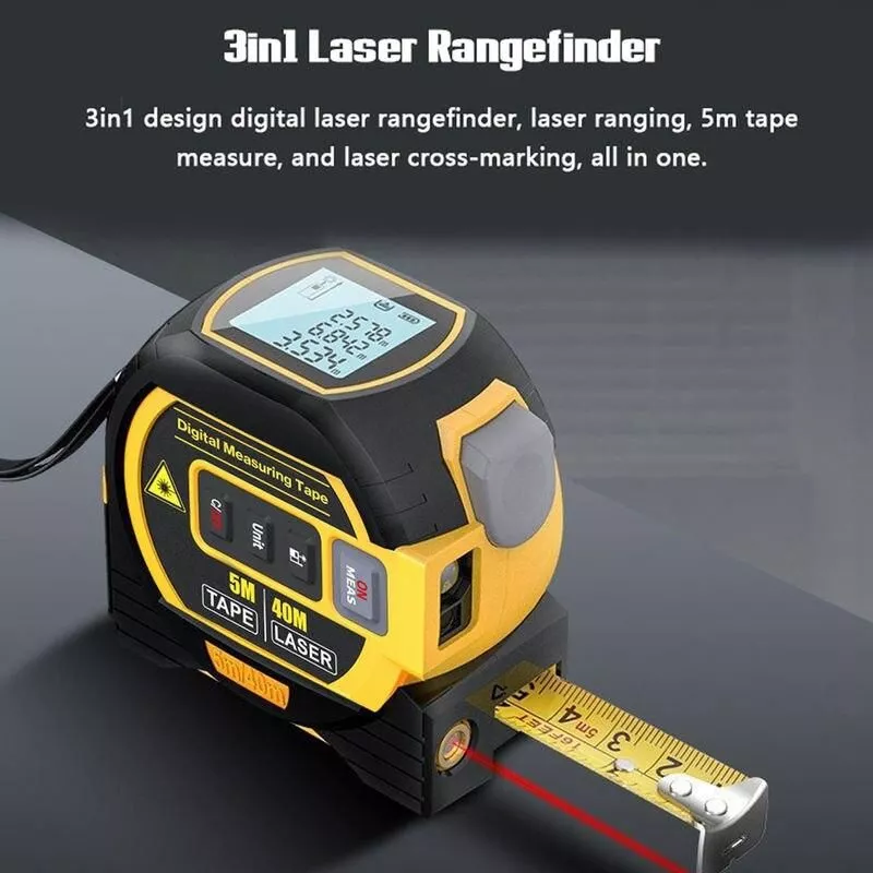 - 3-in-1 Design: Combines a digital laser rangefinder, a 5m tape measure, and laser cross-marking capabilities.