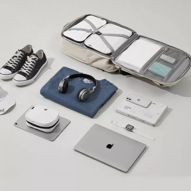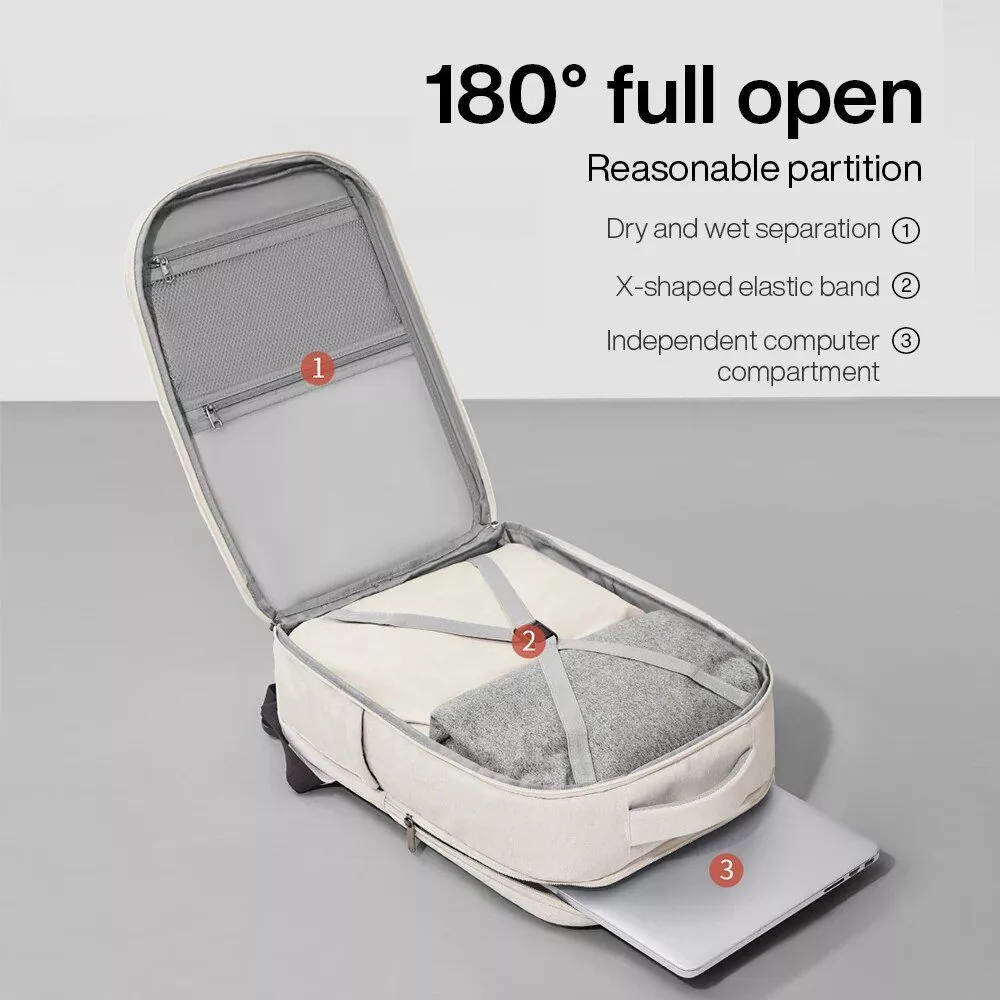 Our backpack boasts a myriad of features that cater to all your needs. The interior is crafted with OEKO-TEX00 certified materials, ensuring safety, comfort, and skin-friendly contact. It’s more than just a bag; it’s a portable “luggage” solution with a 180° full opening and a massive 22L capacity, ideal for 3-5 days of travel. The X-shaped corset belt keeps your clothes organized, while separate dry and wet pockets ensure your digital accessories and toiletries are well sorted. The water-repellent fabric adds durability and ease of maintenance, making it an all-weather ally.