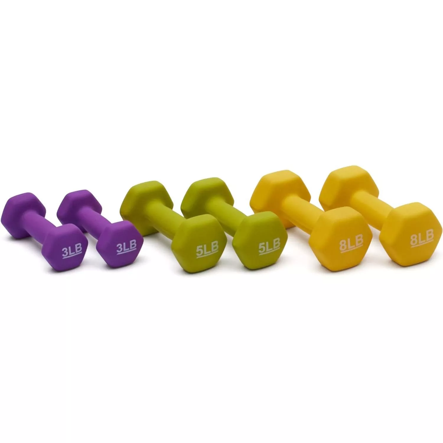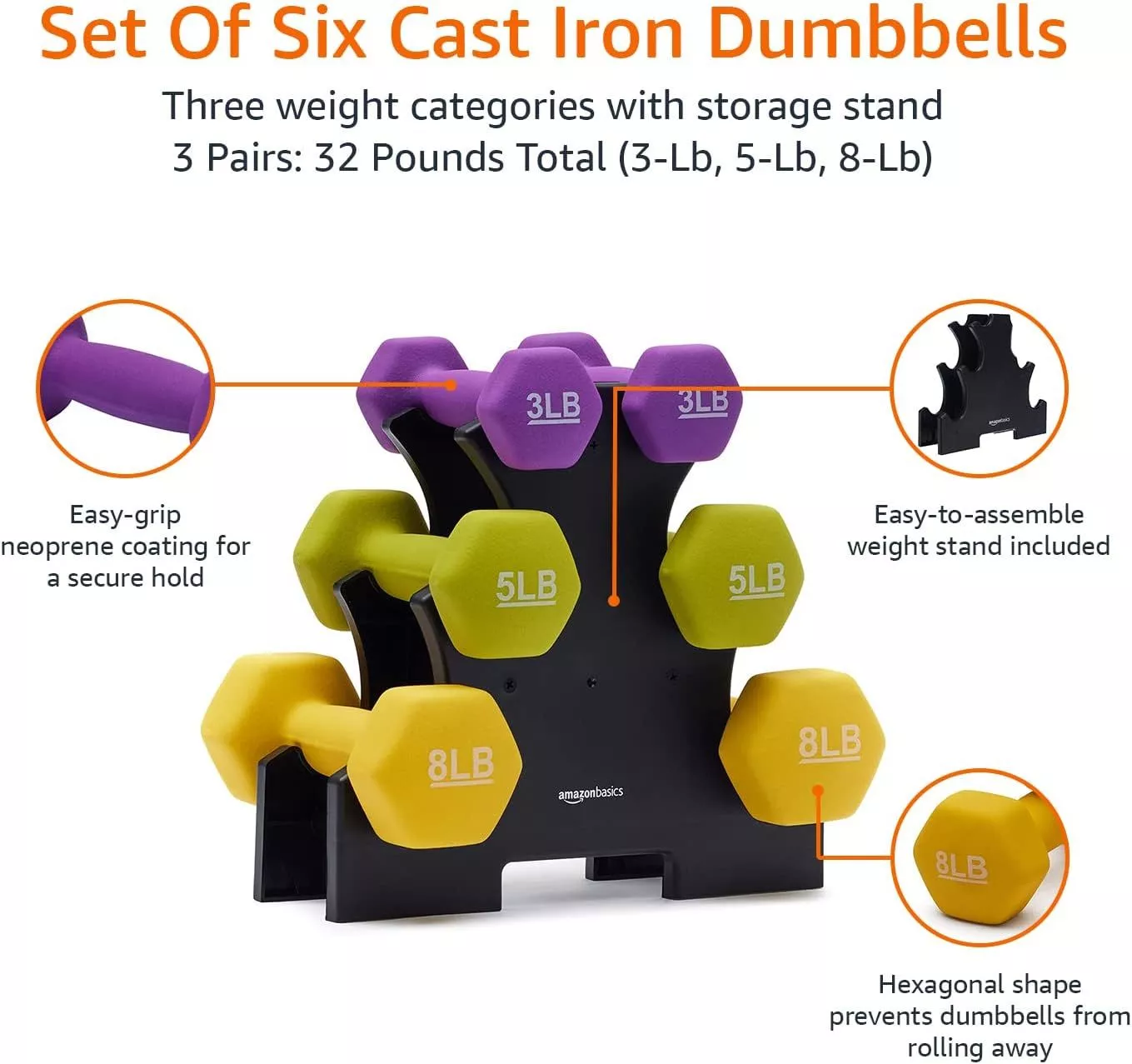 - Includes 3 pairs of dumbbells: 3, 5, and 8 pounds (6 total)