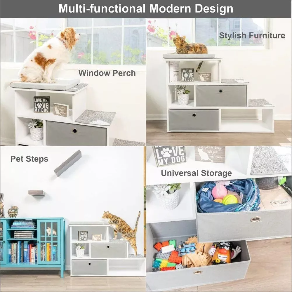This 28″ tall perch serves a multitude of purposes. The padded perch not only offers your pets an elevated sanctuary with an 8″ stair height but also functions as a storage haven. Two premium storage baskets help declutter your home by providing a perfect spot for your pet’s toys, treats, and accessories, or any other items that need a designated home. The best part? It’s reversible, adapting to your evolving home and space needs.