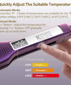 - Customizable Temperature Settings: Press “P” for preset temperatures – 270°F for fragile hair, 350°F for damaged/colored hair, and 410°F for healthy hair.