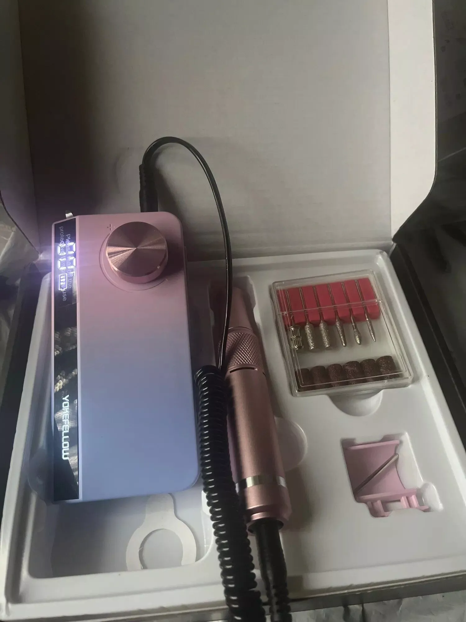 This rechargeable nail drill machine is amazing. it’s very easy to use and perfect for at-home manicures. the drill is powerful and has multiple speed settings for precise control. the rechargeable battery lasts a long time and makes the drill very portable. the attachments are great and cover all my nail needs. the drill is quiet and doesn’t get hot, even with prolonged use. my nails look professionally done every time. it’s a fantastic tool that saves me time and money. i’m very happy with this purchase and highly recommend it to anyone who loves doing their nails. it’s a great investment for maintaining beautiful nails at home.